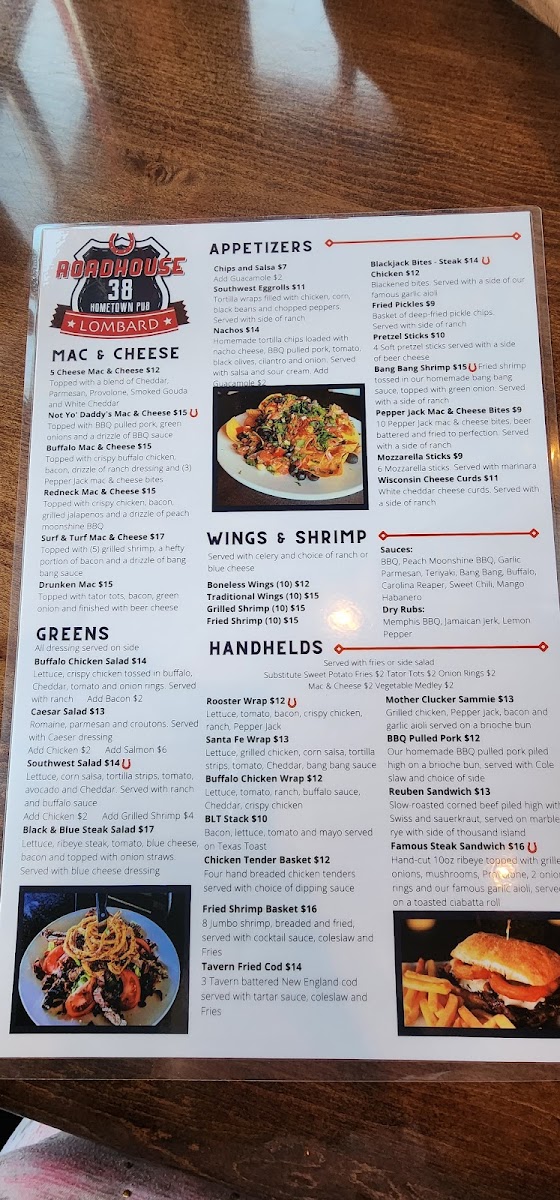 Welcome to Roadhouse 38, a charming eatery located at 275 W Roosevelt Rd, Lombard, IL, where food meets warmth and hospitality. This family-owned spot offers a diverse menu designed to please every palate. From the tantalizing Rooster Wrap to the hearty Cowboy Pork Chop, each dish is crafted with fresh ingredients, ensuring a delightful experience.